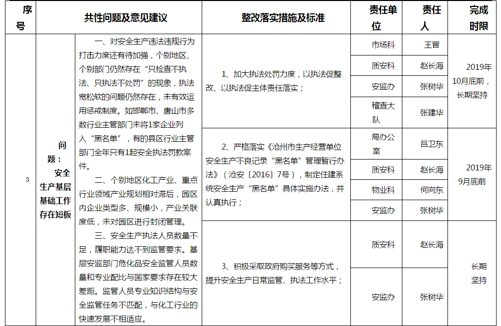 国务院安委会考核巡查组共发现102项具体问题,其中,省级层面3项,延伸巡查的唐山市、邢台市、邯郸市等3个市共99项,涉及住建部门具体问题1项、住宅小区具体问题12项。指出了全省3个方面的共性问题,提出了5个方面的意见建议(涉及住建系统4个方面)。市住建局结合我局工作实际制定了《沧州市住建局国考巡查共性问题及意见建议整改落实责任清单》,各责任单位和责任人员要严格按时限抓好落实工作。