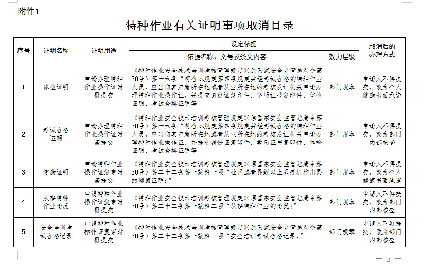 为深入贯彻落实党中央、国务院关于减证便民、优化服务的部署,根据《国务院办公厅关于做好证明事项清理工作的通知》(国办发〔2018〕47号)和《应急管理部公告》(2018年第12号)有关精神,省厅决定,自2018年12月4日起,取消由部门规章设定的5项特种作业证明事项、5项注册安全工程师证明事项(见附件),请认真抓好贯彻落实,并将此文转发至本行政区域内有关生产经营单位、安全生产培训机构和考试机构。